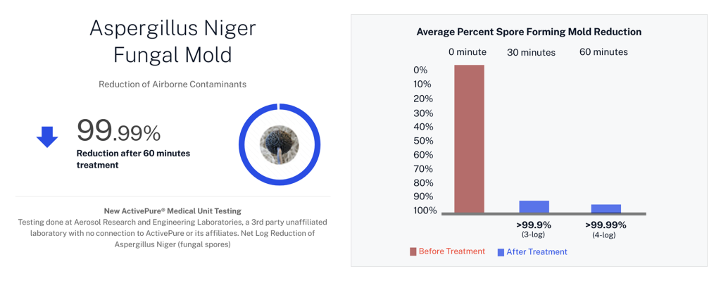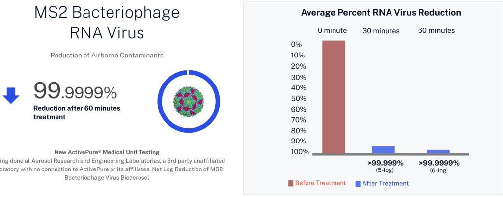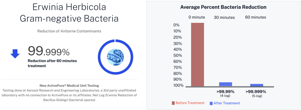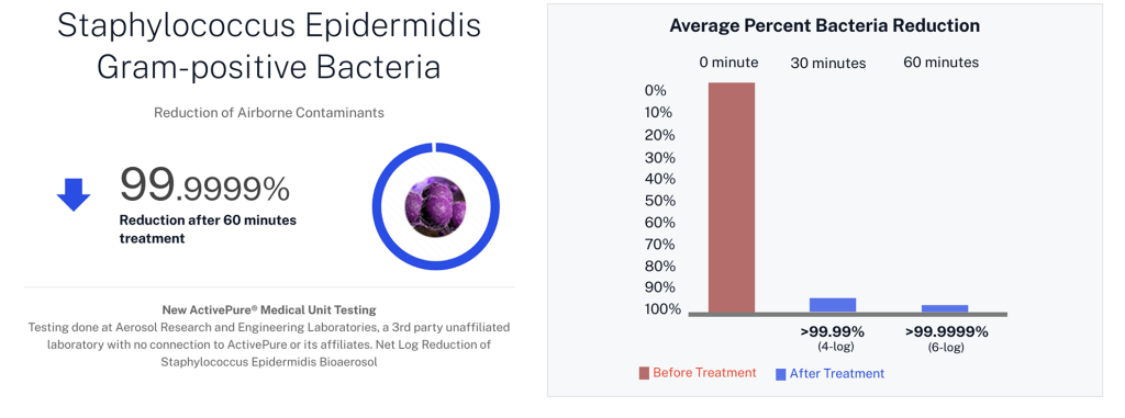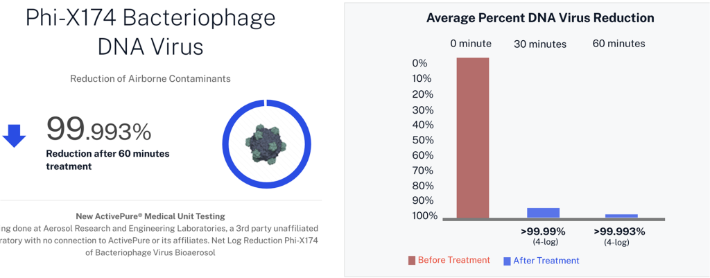 Developed from NASA-inspired innovations, ActivePure® operates safely 24/7 without the use of ozone or harsh chemicals. The FDA-cleared unit has been scientifically validated to reduce a range of microorganisms, including staphylococcus epidermidis and erwinia herbicola bacteria; MS2 and Phi-X174 viruses; aspergillus niger fungal spores; and bacillus globigii bacterial spores under controlled clinical conditions. This positions ActivePure® Medical Guardian as the first and only FDA-cleared, real-time, active air purification system of its kind.